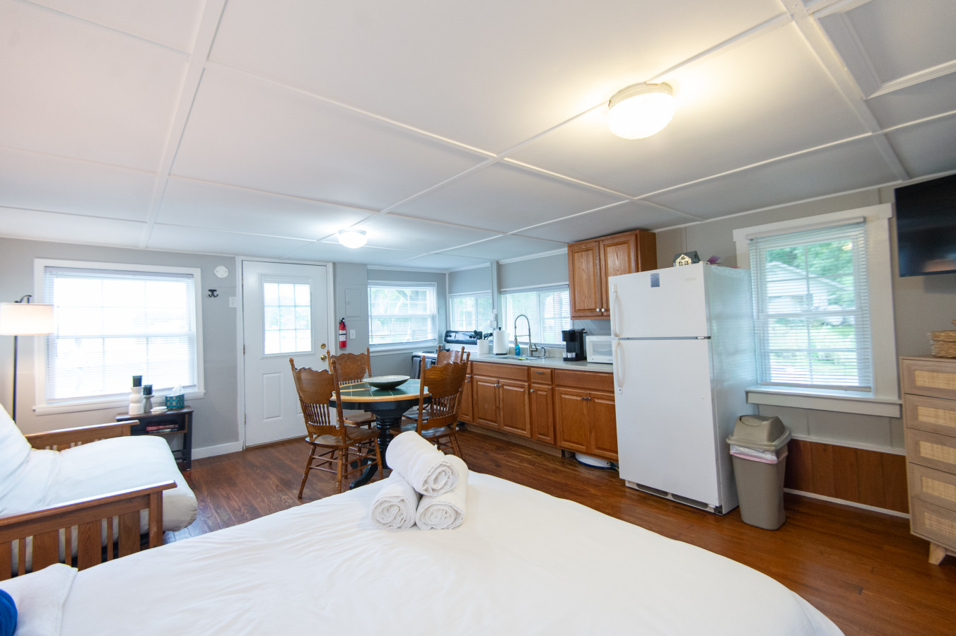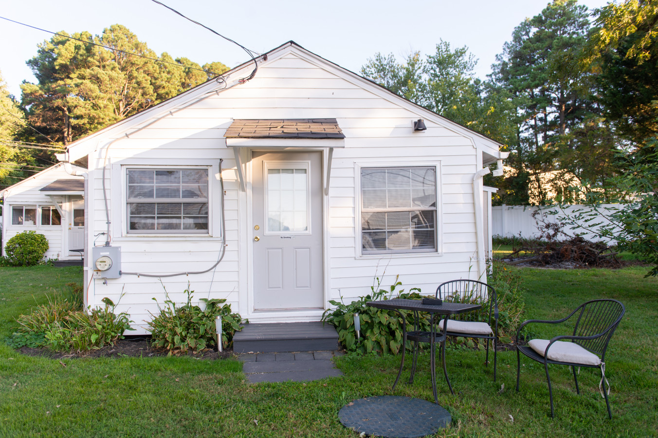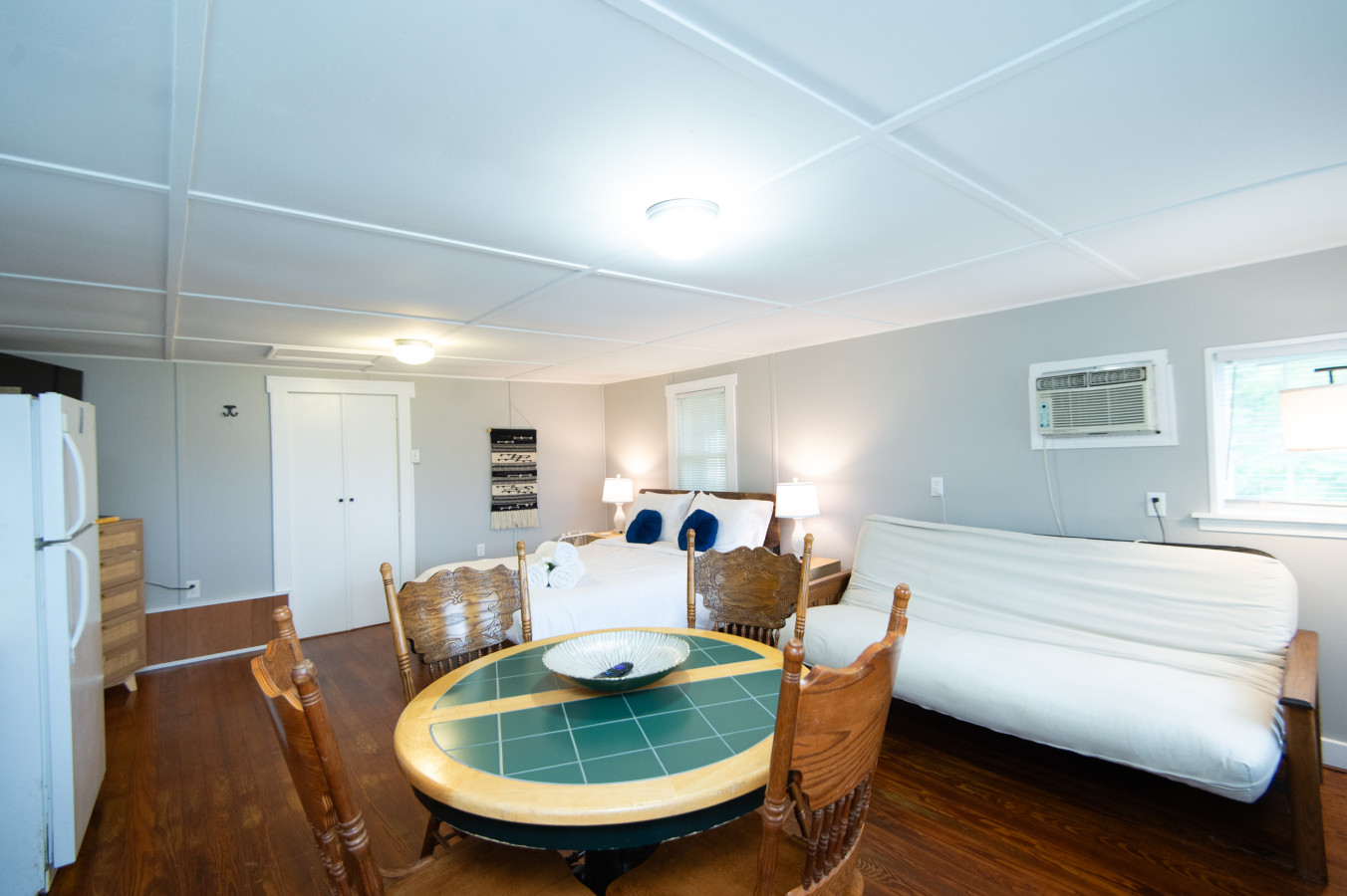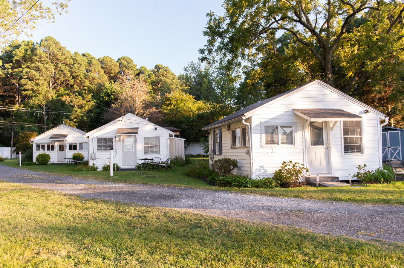 / nightRelax with the whole family at this peaceful place to stay. Great Sunset and Sunrises, located on Harris Creek, each cottages is on angle so no view is blocked. Open Studio style room with queen size bed one side, futon open to full size will sleep 2, other side is full kitchen incl: microwave, full sz refrigerator and stove, equipped with utensils, silverware, pots, pans, dishes, cups, glasses. Beds have quilts sets, pillows (4) plenty of seating on grounds, fire pit, steam station etc.