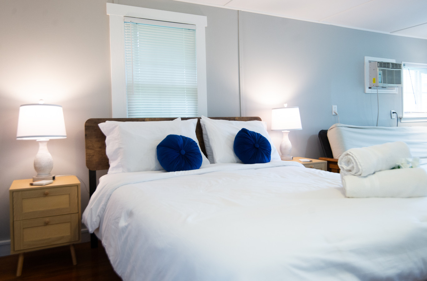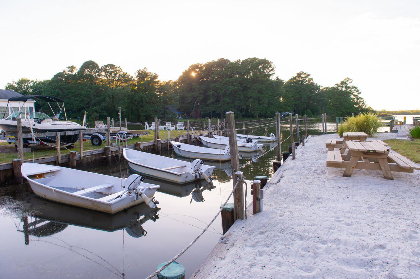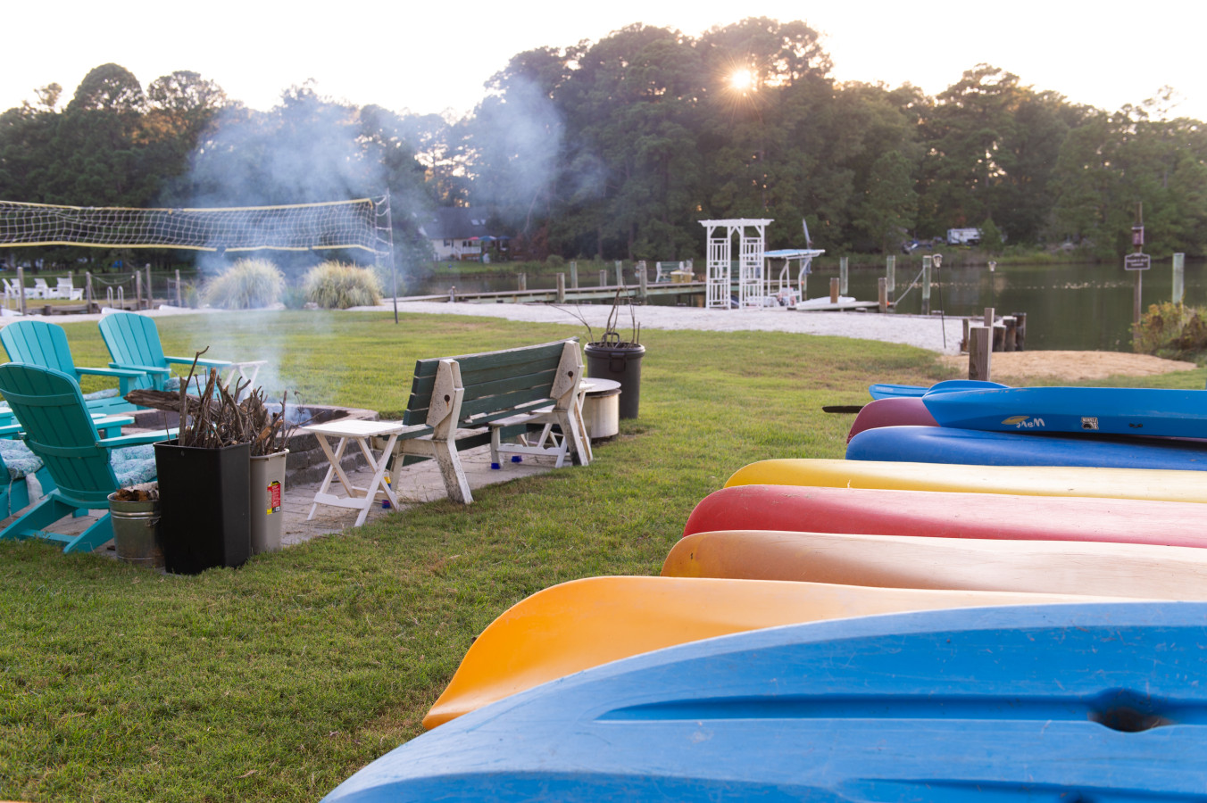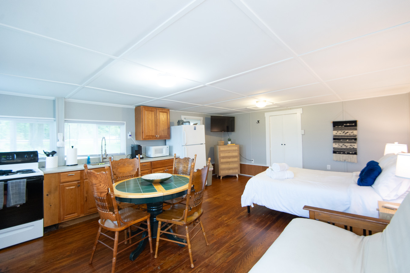 / nightRelax with the whole family at this peaceful place to stay. Great Sunset and Sunrises, located on Harris Creek, each cottages is on angle so no view is blocked. Open Studio style room with queen size bed one side, futon open to full size will sleep 2, other side is full kitchen incl: microwave, full sz refrigerator and stove, equipped with utensils, silverware, pots, pans, dishes, cups, glasses. Beds have quilts sets, pillows (4) plenty of seating on grounds, fire pit, steam station etc.